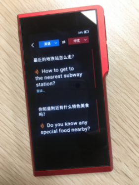 笔者做了个简单的尝试,按下翻译宝右上侧的语音输入红/蓝键,随意讲出一句中国话,松开按键的瞬间,几乎是同一时刻,翻译宝已响起了发音标准、语意准确的英文译音。屏幕上有历次翻译的中英文对照、发音按钮,也许是为了嘈杂环境下可以多次播放避免重复输入。
